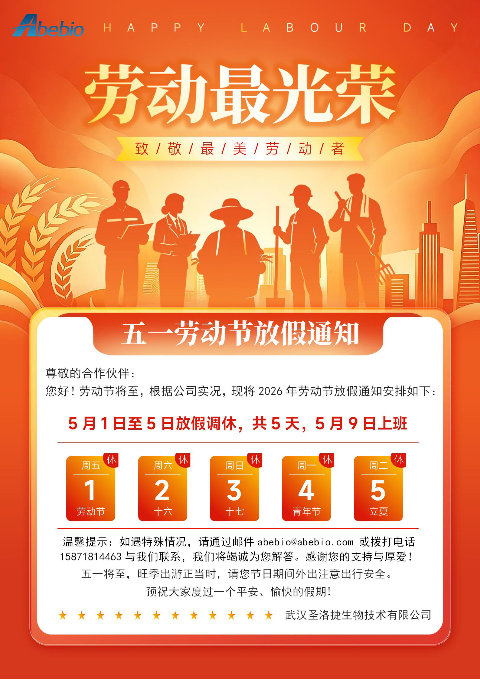 Current Position: Home>>新闻动态>>公司新闻 >>Abebio 2026五一劳动节放假通知