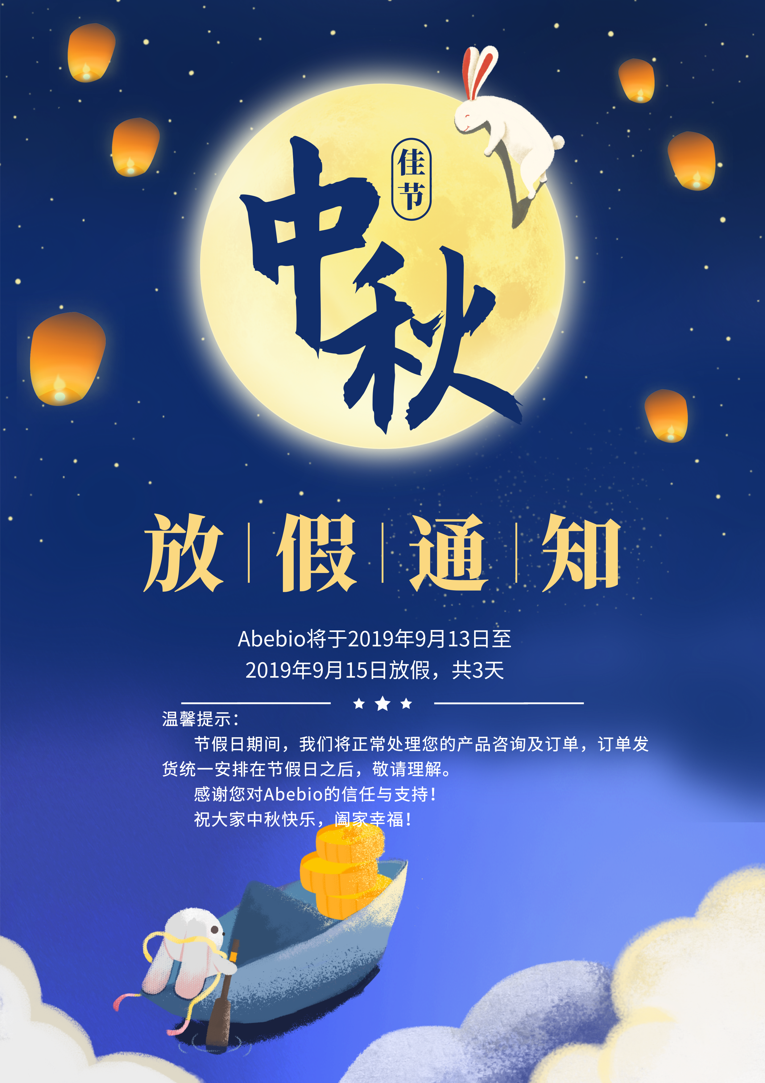 Current Position: Home>>新闻动态>>公司新闻 >>Abebio 2019中秋放假通知
