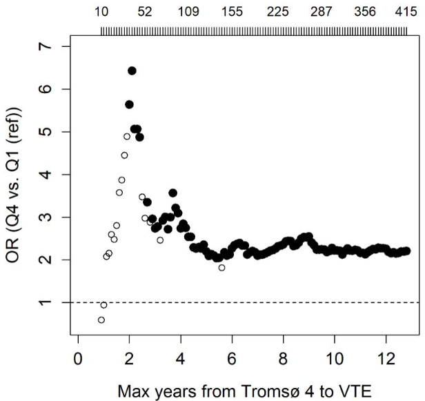 这是一项基于人群的嵌套病例对照研究,招募了416名静脉血栓栓塞患者和848名来自Tromsø 研究的年龄和性别匹配的对照。Logistic回归用于计算GDF-15四分位数间静脉血栓栓塞的优势比(OR)。